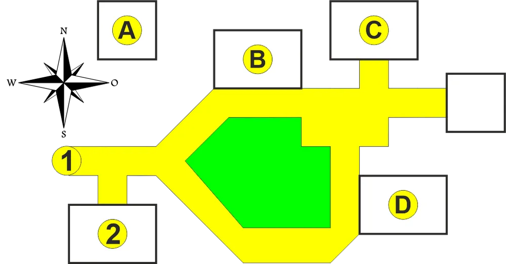 1 - переход в старый город. 2 - сторожка. A, B, C, D - склепы.