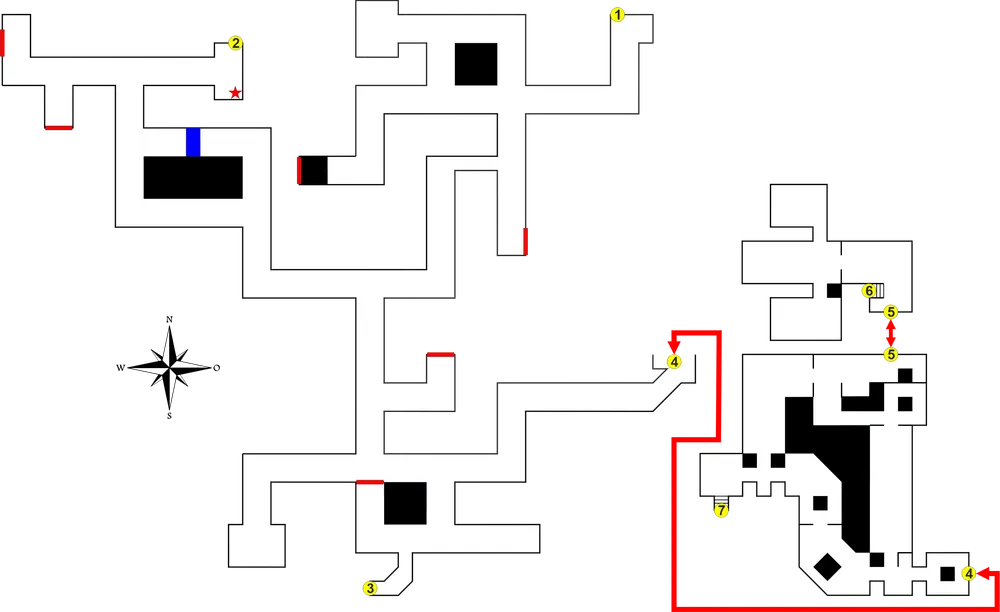 1 - выход в правительственном районе. 2 - выход в университетском районе. 3 - щель в стене (переход в АлуэтКредитБанк). 4 - переход между восточным и западным подземельем. 5 - переход между западным подземельем и логовом разбойников. 6 - выход в таверну "У городских ворот". 7 - переход между западным подземельем и руинами (см. выше 7.1. Алуэт: пропавший кузнец). Красными прямоугольниками показаны стены из решеток. Звездами показаны контейнеры.