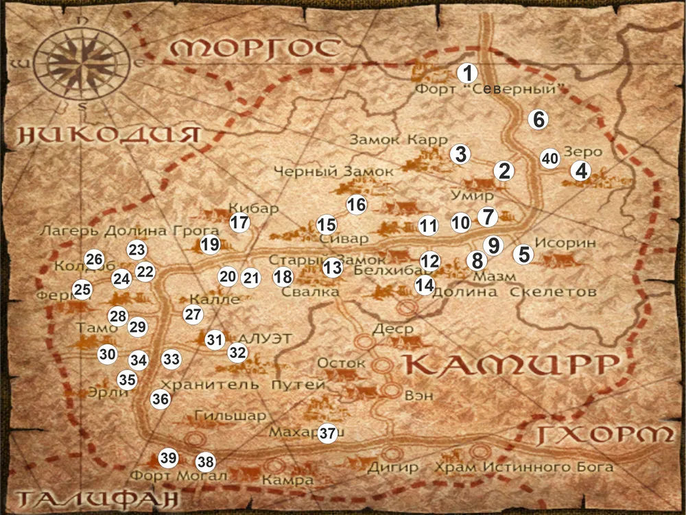 1 - форт Северный. 2 - деревня Умир. 3 - замок Карр. 4 - деревня Зеро. 5 - Исорин. 6 -заброшенная шахта. 7 - подземный город. 8 - Мазм. 9 - серебряный рудник. 10 - восточный вход в гробницу Изидора. 11 - западный вход в гробницу Изидора. 12 - Белхибар. 13 - Старый замок. 14 - Долина скелетов. 15 - Сивар. 16 - Черный замок. 17 - Кибар. 18 - свалка. 19 - подземелье личей. 20 - деревня Тихая гавань. 21 - вампирский замок. 22 - таверна "Голова ворна". 23 - лагерь Долина Грога. 24 - Колдоб. 25 - фермы. 26 - кладбище. 27 - Калле. 28 - Тамо. 29 - два склепа. 30 - запертая дорога в Никодию. 31 - кузница Торио. 32 - Алуэт. 33 - таверна "Черная рука". 34 - разрушенный форт. 35 - Эрли. 36 - Хранитель Путей. 37 - Махариш. 38 - форт Могал. 39 - руины Древних. 40 - развалины дома нотариуса.
