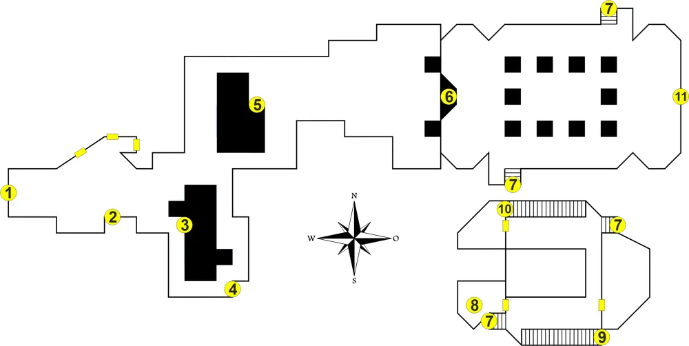1 - выход из города. 2 - дом торговца. 3 - кузница. 4 - дом колдуна. 5 - магическая лавка. 6 - вход в лабораториум. 7 - переход между первым и вторым этажами. 8 - Урассул. 9 - переход в обеденный зал. 10 - переход в библиотеку. 11 - вход в подземелье лабораториума.