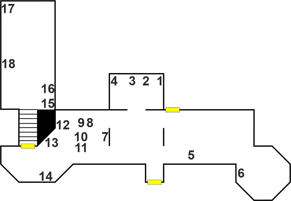 6.4. Тамо: книга для архимага Дуэте (окончание). Добравшись до Алуэта, заходите в университет (см. рисунок выше). Здесь много книг, стоящих на стеллажах. Вы можете безнаказанно брать все, что угодно, но, как только вы заберете "Necroticum" со стеллажа, который стоит в западной части верхнего этажа (на плане он помечен как № 13), все маги-иммерситы, находящиеся в университете, нападут на вас. Архимагу Дуэте нужна именно эта книга.