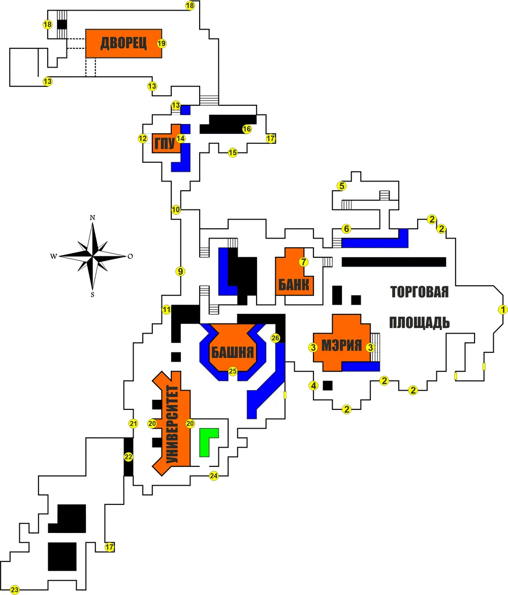 1 - выход из города. 2 - склад (охраняются одним-двумя механическими големами, но в них можно разжиться разнообразными товарами). 3 - вход в мэрию. 4 - магическая лавка. 5 - мастер-оружейник (у него можно приобрести 35 зарядов к Пасти дракона, артефактное оружие, зарядные устройства, а из сундука забрать книгу "Тайна мириара" (см. ниже Дополнение). 6 - особняк с книгами. 7 - АлуэтКредитБанк. 8 - пустое жилище. 9 - ювелирный магазин. 10 - переход между торгово-административным и правительственными районами. 11 - переход между торгово-административным и университетским районами. 12 - жилье горожанина. 13 - вход в штаб рейнджеров. 14 - главное полицейское управление (ГПУ). 15 - дом Хизза Оркана. 16 - обильный дом. 17 - спуск в канализацию. 18 - тренировочный зал мастера Волара (повышает мастерство владения древковым оружием). 19 - дворец герцога. 20 - университет. 21 - дом генерала Мугиба. 22 - баррикада. 23 - дом Закла. 24 - обитаемое жилье. 25 - башня звездочета. 26 - тренировочный зал (повышает мастерство владения ударным оружием).