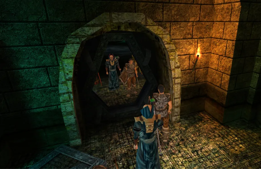 К востоку от кузницы через дорогу расположены какие-то руины. Зайдя в них, перебейте крыс и пауков, попадающихся на пути. Коридор ведет на запад к двери, ответвляясь на север в пещерный проход. Этот проход ведет к подземному логову разбойников, откуда можно выбраться на поверхность через таверну "У городских ворот", которая находится в предместье Алуэта. За дверью на западе расположено подземелье, куда нам и нужно.
