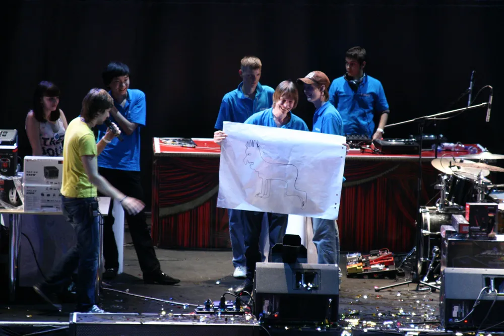 Пока мы совершали набег на еду, дело близилось к подаризациям. Для начала прошло награждение по FreeStyle Online: четыре команды получили в свое распоряжение мячи, форму и девайсы. Вдогонку к первому награждению ведущий решил провести несколько конкурсов: по его словам, спонсоры турнира так расщедрились, что девать девайсы от Thermaltake, Sony Ericsson, Transcend и иже с ними им ну совершенно некуда, поэтому они разыграют сабж. Верю всему вышесказанному: сцена была практически завалена коробками. Часть призов ушла в народ по итогам музыкального конкурса (его я застала лишь частично, так как общалась с Дмитрием). А вот рисовальный конкурс я лицезрела во всей его красе. Угу, которая страшная сила. ^^ Пятерке ребят было предложено нарисовать победителя турнира. Изобрази, мол, добрый друже, геймера, который войдет в этот зал после победы в турнире. Ну.. они и изобразили. Самый восторг у публики вызвало эпическое полотно "Рачком прогнулся", на котором некий муми тролль с орлиным профилем стоит на карачках. Хотя, вероятно, я бы так же вползла в Арену после напряженной борьбы за первое место. Остальные художники были не столь талантливы и получили меньше респектов публики.