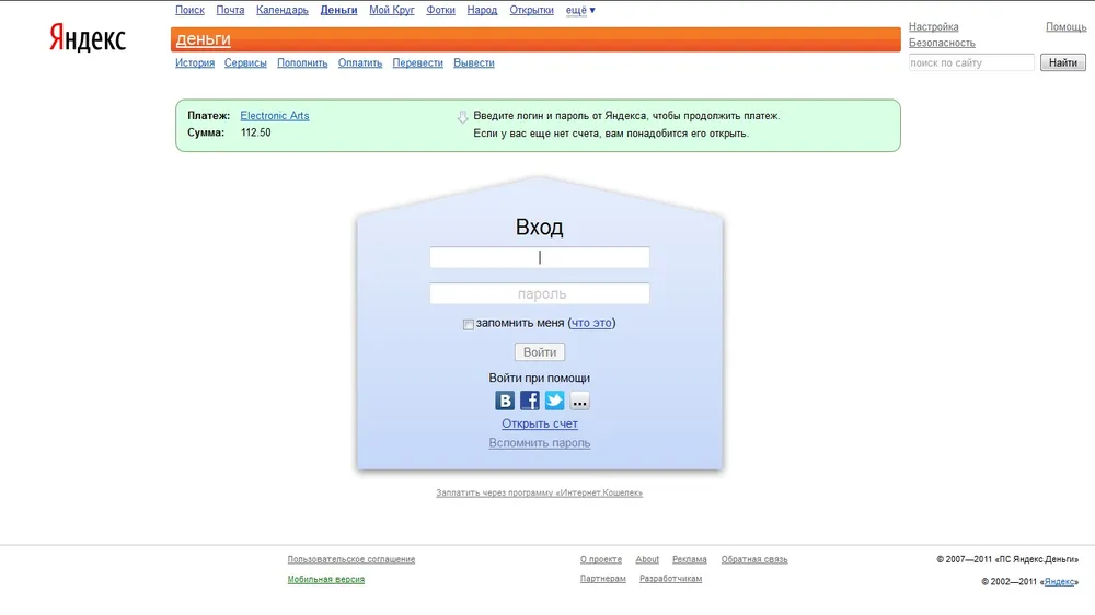 3.2.1 Яндекс.Деньги вводим Логин и пароль от Яндекс почты.