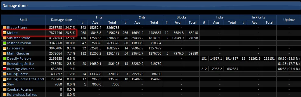 Как вы можете видеть, целых 23,5% от всех повреждений нанесённых этим игроком, отображаются как «Melee», что подразумевает их нанесение базовой автоатакой. И тут всплывает один нюанс, а именно, что у этого класса есть несколько кнопок позволяющих ему увеличить свой базовый урон. Но факт остаётся фактом, эти 268 ударов сделаны абсолютно без какого-либо участия со стороны игрока. Фактически, если досконально разобраться в этом, то Instant Poison, Deadly Poison и Main Gauche – всё это наносящие урон способности, урон от них вместе взятых сопоставим с уроном от автоатаки. Таким образом, практически 45% всего урона от этого персонажа без какого либо участия игрока приходится на автоатаку. Конечно, это крайний пример, однако это не меняет сути вопроса, практически половина от всего урона была нанесена под контролем компьютера.