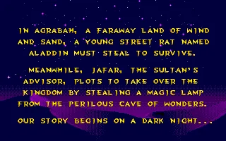 Итак,злой волшебник Джафар похитил принцессу Жасмин.Аладдин отправился на спасение своей возлюбленной (не напоминает ли Вам эта игра "Принца"). По пути ему будут попадаться охранники, призы и т.д. Hу что ж, начнем...
