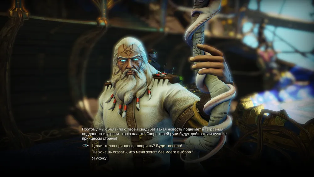 После окончания первого хода на «Ворон» стекутся принцессы изо всех стран, чтобы вы выбрали себе невесту. Вот как зовут этих претенденток: Лоэнна (эльф), Аида (гном), Камилла (ящер), Офелия (нежить). Они, правда, думают, что я женюсь на гномихе? Да лучше уж нежить, чем такое чудо. Также, можете спросить у Максоса, где принцесса – человек, и что случилось с принцессой – импом. Заходите в тронный зал и говорите с советниками и принцессами о свадьбе. У каждой будет своя точка зрения на эту ситуация. Также, можете наведаться в бар и получить одобрение от своих генералов. Решив на ком жениться, возвращайтесь в королевскую каюту и говорите Максосу о своем выборе. Проматывайте ещё один ход и возвращайтесь в тронный зал на свадьбу. Лично я выбрал Камиллу (ящерица), ведь союз дракона и ящера – это круто и обещает быть весело. После свадьбы на корабле «Ворон» появится ещё одна комната – покои королевы. Можете навещать её покои для утех или разговоров. Вдобавок вы получите приданое: 15 золотых и 30 единиц исследования.
