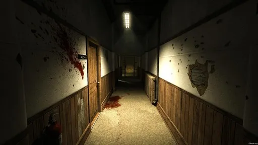 Рассмотрев палату, подходим к запертой двери. Через некоторое время ее откроют. Теперь выходим и сразу направляемся налево,вниз по лестнице.Здесь мы видим еще одного психа,бьющегося головой о стену.Мы снова поворачиваем налево и поднимаемся наверх,идем по коридору.Тут мы снова видим разлом в стене.Идем в него и проходим направо.Здесь нам должна попасться дезинфицирующая камера. Идем далее по следу из крови жертвы.Поднимаемся наверх и видим психа,водящего головой по окровавленной стене. Затем прыгаем в дыру на полу,проходим налево (возле комнаты охраны). Здесь мы слышим крики и парня,убивающего свою жертву. Идем далее,к открытой двери. Здесь нас ждет сюрприз - маньяк с битой,которого нужно выманить.Сделав это,заходим в комнату и поворачиваем рубильник.После этого возвращаемся к комнате с дезинфекцией.Проходим далее.