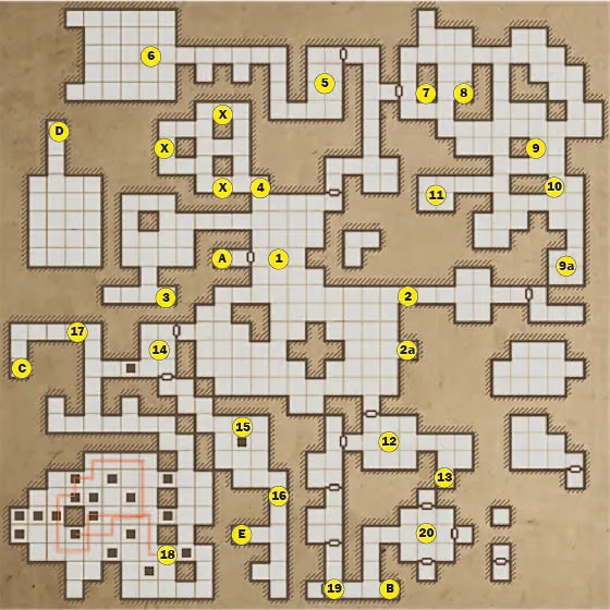 После боя с пауками, скорее всего, вам понадобится кристалл жизни, чтобы исцелить раны и оживить погибших. Поэтому на данном этапе лучше всего сосредоточить внимание на доступе в комнату с кристаллом жизни (12). После исцеления сосредоточьтесь на уничтожении огра. Вам необходимо убить его, чтобы завладеть его мешком, в котором помимо припасов хранится золотой ключ, который понадобится вам для поиска сокровища (20).