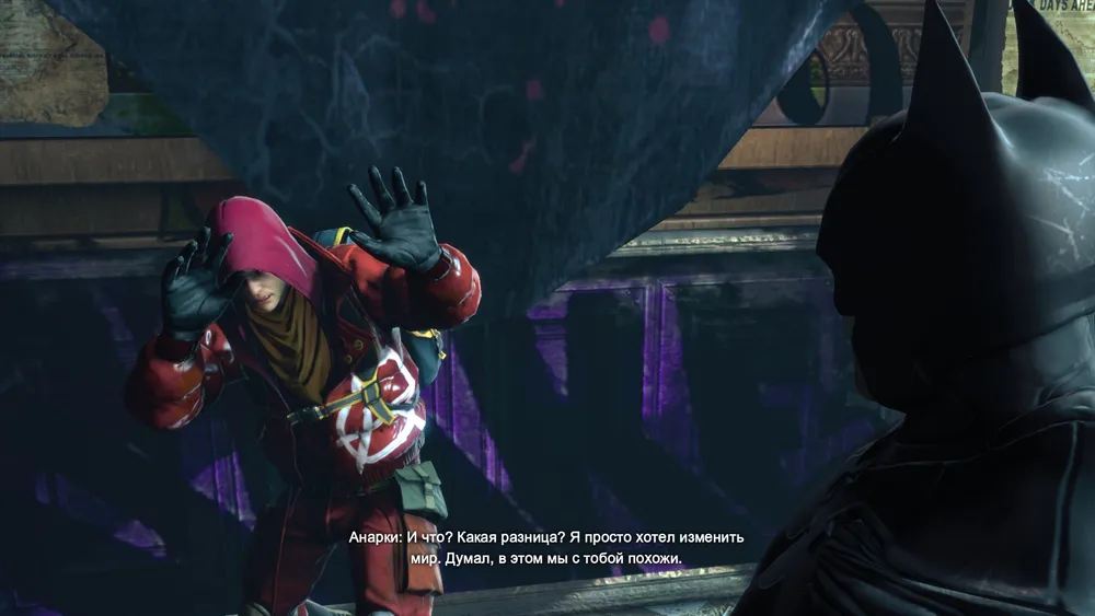 Узнав, что вы решили обезвредить все бомбы и спасти продажное общество, Анарки вызывает вас в здание суда для сражения. Ну что же, надо идти. В здании суда разбираемся с Арки и его приспешниками. Арки оказывается обычным ребенком, но Бэтмен все равно его связывает и оставляет полиции. Также можете послушать его пылкую речь о ситуации в Готэме, а после выйти из здания суда. На этом задание завершается.