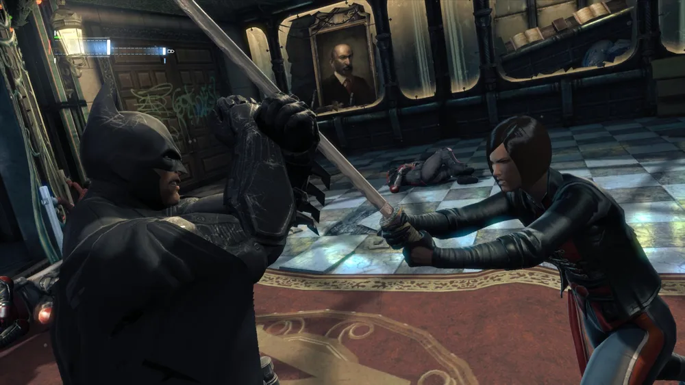 Выходя из банка, вы увидите коляску, из которой доносится плач. Подойдите к ней и увидите что в коляске пусто, а сзади на вас нападет Шива. Знакомая Бэтмена, кстати. Вы не будете с ней драться, она скажет, что в Готэме может погибнуть невинный человек и Бэтмен должен его спасти. Приходим на метку и слышим крики. Это из торгового центра, значит идем туда. В торговом центре висит полицейский, а под ним электрический бассейн. Попробуем спасти его. Идем на левую сторону и вырубаем щиток. На нас налетят три ниндзя, судя по всему, подарок от Шивы. Избавляемся от них и с помощью когтя Дестроука делаем трос и перебираемся на другую сторону. На другой стороне вырубаем щиток и опять деремся с друзьями Шивы. После этого освобождаем полицейского и говорим с ним. Благодаря полученным знаниям сканируем местность в поисках улик и выходим из здания. На улице следуем по уликам и находим накрытый труп полицейского. Сзади нападет Шива – контратакуем и говорим с ней.