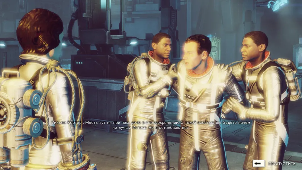 Можете прождать 35 секунд и увидеть взрыв комплекса, а можете связаться с одним из трех членов команды: Уивер, Уир или Фолк. Уивер и Фолк хотят убрать Картера и спасти жизнь эфириалу, а доктор Уир занят своими разработками и размышлениями о природе нашего эфириала. В кого вселяться решать вам, а я вселился в Уивер. После этого мы арестовываем Картера и забираем его на корабль. Теперь нужно лететь к кораблю чужих и навсегда уничтожить его.