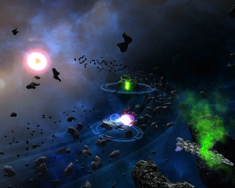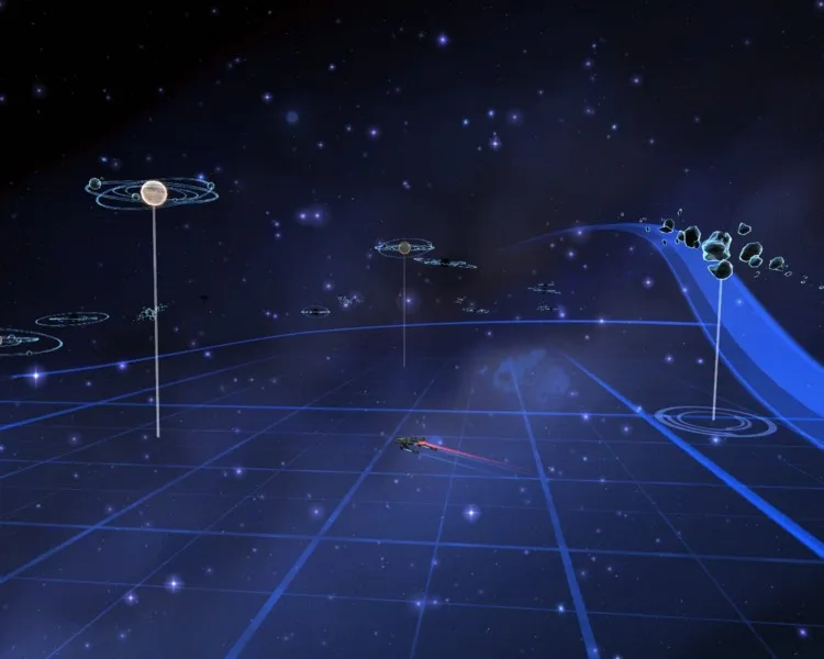 Экшен происходит в основном в открытом космосе — самой отлаженной и заполненной контентом части игры. Карта галактики напоминает трехмерный аквариум, в котором плавают звездные системы и метеоритные поля, а между ними носятся стайки кораблей. Перелет между соседними планетами занимает всего несколько секунд. Достаточно подлететь к объекту, как табличка на экране предложит варпнуться внутрь. Щелчок мышью — и вы на месте. Реалистичностью, конечно, и не пахнет, зато даже сорокалетний поклонник Star Trek разберется, как с Земли добраться до Терра Новы.