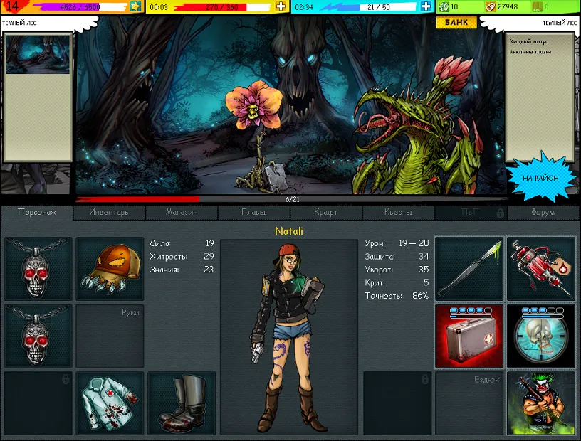 В начале игры каждый игрок получает по 10 очков характеристик и + 2 очка на одну из этих трех, в зависимости от профессии (аватара). Амазонка и Качок - сильны физически, Трюкач и Бестия - хитры, а Умница и Умник - обладают знанием. Каждый уровень приносит 3 дополнительных очка талантов, распределять которые можно по своему желанию. Но будьте внимательны, ведь разные предметы снаряжения требуют определенных характеристик. Так например, оружие требует больше Силы, броня - Хитрости, а аксессуары Знания.