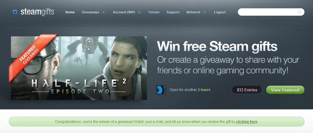 Если свершилось чудо и вы выиграли, на всех страницах Steamgifts будет показываться зелёный баннер.