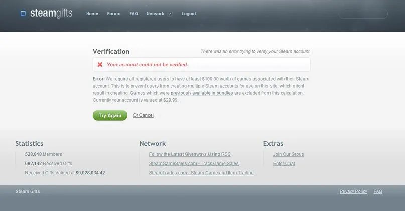 2. Иметь в своей библиотеке Steam (именно там, а не в инвентаре) игры, стоимость которых в сумме равняется как минимум 100$. Не важно, за сколько вы их купили и купили ли вообще, кого вы из-за них убили и т. д. Учитывается лишь полная цена (без скидок) в магазине Steam. Да я богат! Но игры, которые хоть когда-нибудь продавались в бандлах (сборниках игр, например Humble Bundle) не в магазине Steam — не считаются (их список можете посмотреть здесь — http://www.steamgifts.com/bundle-games). Когда вы попытаетесь войти на сайт, библиотека будет оценена и вас обрадуют общей стоимостью ваших игр, если она меньше 100$.