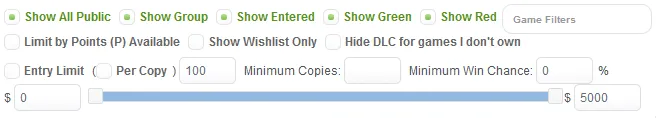 Позволяет вступить сразу в несколько раздач нажатием одной кнопки. Вступает по порядку в первые раздачи на странице, пока хватает поинтов. Предварительно можно отсортировать раздачи по текущему шансу на выигрыш или вывести только те игры, что входят в ваш список желаемого. Также можно скрывать игры с неподходящим Contributor Value, DLC и отдельные игры по своему усмотрению.