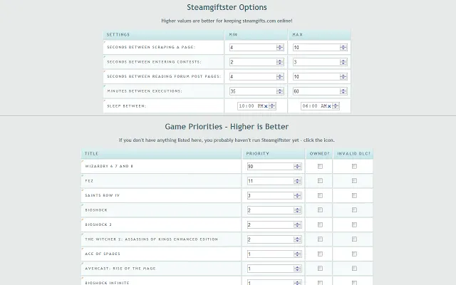 Расширение для автовступления в раздачи. Сначала вы создаёте список игр, которые хотели бы получить, и указываете для каждой приоритет. При запуске расширение откроет новую вкладку и станет переходить по страницам сайта. Сканируя раздачи, оно будет вступать в нужные. Если вдруг появится раздача игры, для которой вы задали более высокий приоритет — расширение выйдет из какой-нибудь с низким приоритетом (если у вас не хватает поинтов) и вступит в эту раздачу.