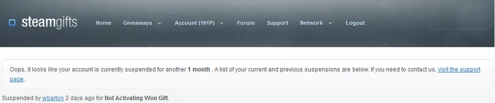 Если победитель не активировал выигранную игру на свой аккаунт. Модератор может это проверить либо по собственной инициативе, либо по жалобе создателя раздачи. Обычно даётся временный бан по 5 дней за каждую неактивированную игру. Игры, полученные на SteamGifts, предназначены для того, чтобы вы сами в них поиграли, а не для передаривания или перепродажи.