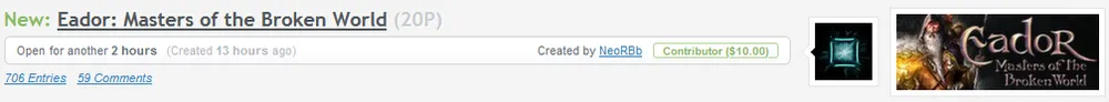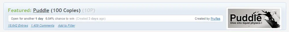 4. Массовые раздачи (Featured или Developer Giveaway). В них раздаётся несколько копий игры (к примеру 50 или 100), то есть победителем будет не один человек, а сразу много. Всем добра в этом баре! При этом количество баллов для вступления остаётся обычным. Они размещаются перед всеми раздачами и имеют особый фон цвета морской волны. Правда, за счёт такой рекламы (несколько дней раздача висит на самом видном месте) число участников измеряется уже не тысячами, а десятками тысяч (как правило, около 20000). Такие раздачи обыкновенно проводят сами разработчики раздаваемой игры.