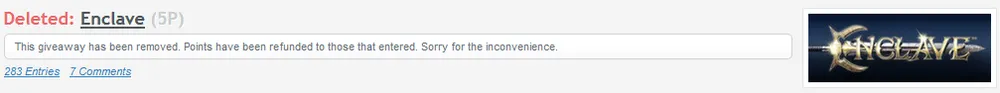в) Вы не сможете создавать раздачи игр, которые в других местах массово раздавались бесплатно (Enclave, Pid, Dead Island Epidemic и др.). Их просто не будет в списке доступных игр. Если же подобная акция по бесплатному раздариванию печенек только началась, и все кинулись раздавать полученное нахаляву — эти раздачи, скорее всего, удалят, вернут участникам поинты, а создателю раздачи не засчитают Contributor Value.