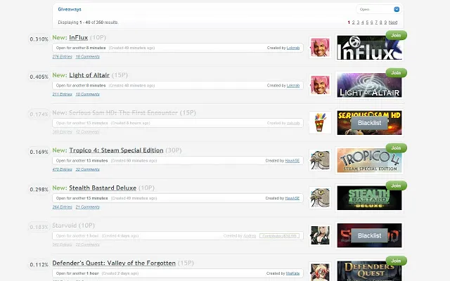 Всё очень просто — находите нужную вам игру, переходите по ссылке и жмёте зелёную кнопку «Enter to Win!». В скобках после неё указано количество баллов (поинтов), необходимых для вступления. Это число зависит от цены игры, 1 балл = 1$. Где же эти самые баллы добыть? Каждый раз, когда кто-то на сайте создаёт раздачу, все получают 5% от стоимости игры. То есть, если раздают игру за 20$, всем начислят 1 балл. Однако накопить таким образом можно максимум 300 баллов. Аррр, а я хотел вступить во все сразу!