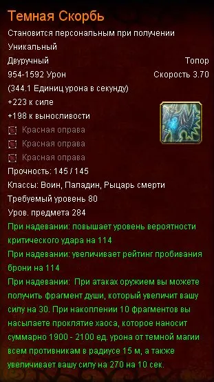 «...огромный двуручный топор, достойный руки гиганта. Он был порожден силами света и скверны, стал вместилищем тысячи мертвых душ, и владеть им могут только самые могущественные воины Азерота. Кажется, что создать оружие, подобное этому топору, невозможно, но слухи о нем не прекращаются. Некоторые кузнецы утверждают, что Темную Скорбь можно сделать из обычного топора, заточив его лезвие до несравненной остроты, другие же полагают, что для его создания нужно оружие невероятной мощи. Утверждают, будто Могрейн, разговорившись, признается, что основой для Темной Скорби, по его мнению, может послужить только молот самого Артаса — но эта невероятная находка станет лишь первым шагом на пути создания великого топора.