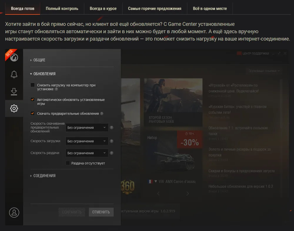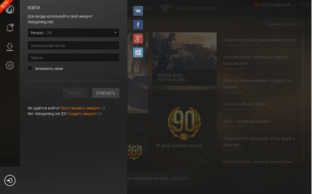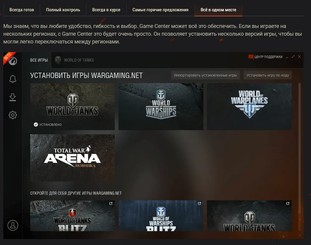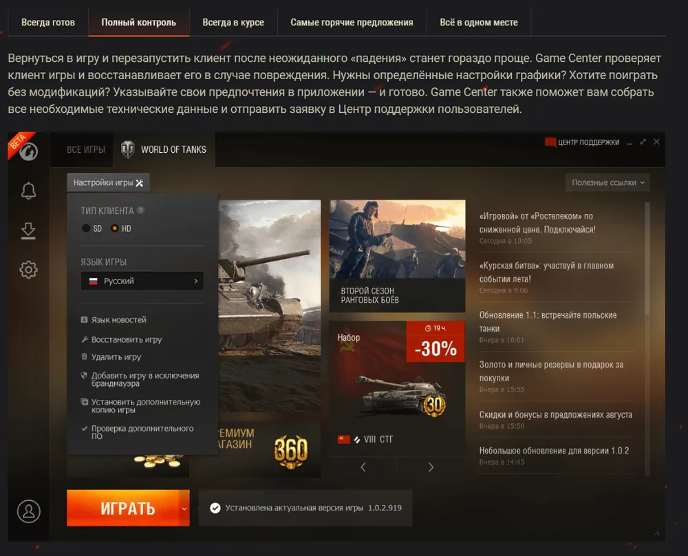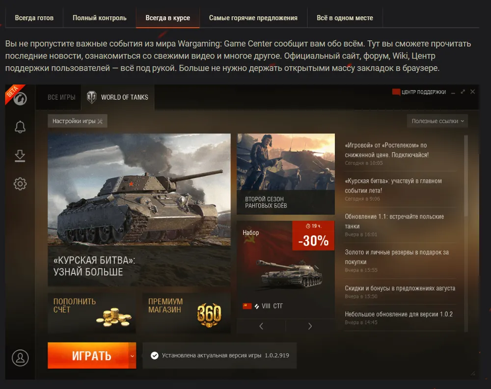 Разработчики продолжают работать над Wargaming.net Game Center, чтобы нам было проще заходить в игру. Очередным улучшением станет добавление функциональности единого логина. Как только игрок авторизуется в Game Center, то автоматически авторизуется во всех проектах, поддерживающих Wargaming.net ID. Нужно просто нажать Играть — и мы уже готовы к бою!