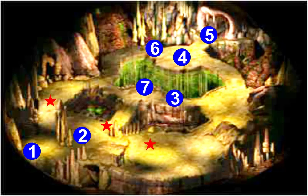 Кроме того, на поле боя вы найдете: кинжал +5, жезл огненных ударов, пригоршню самоцветов, бальзам лечения критических ран, эликсир бычьей силы, эликсир сферы неуязвимости, кольцо замедления (заклинание Замедление), кольцо неверия (заклинание Снятие магии) и кольцо удержания гуманоида (заклинание Удержание гуманоида). Когда будете готовы, используйте портал, чтобы переместиться в пещеру источника.