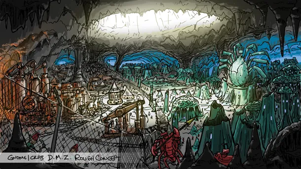 На самом деле, и гномы, и крабы в The Stick of Truth были – первые играли в сюжете не последнюю роль и даже выдавали игроку побочный квест, а одного представителя Крабового народа можно встретить в канализации и подружиться с ним. Однако первоначально в игру планировалось добавить сразу две локации-королевства для гномов и крабов, которые вы можете видеть поблизости. Возможно, разработчики планировали даже устроить небольшой междусобойчик между этими двумя народцами, но, как мы знаем, некоторым планам не суждено было сбыться.