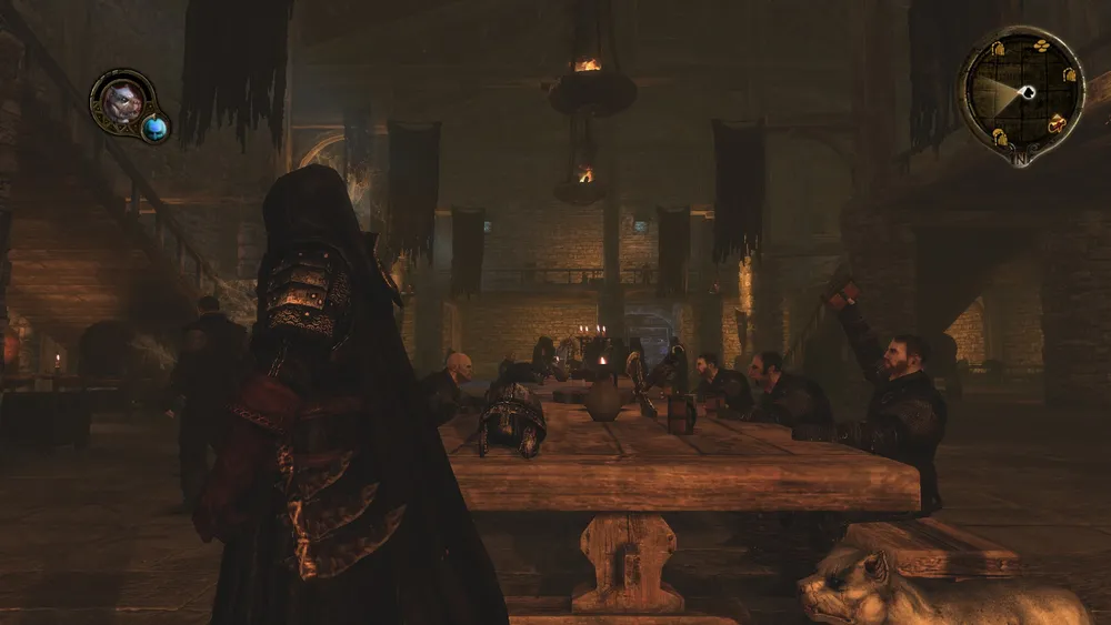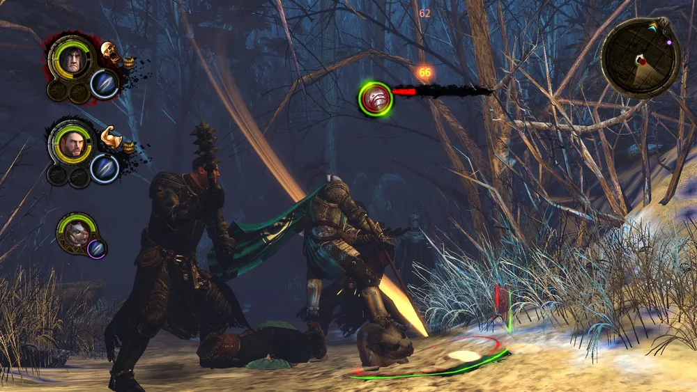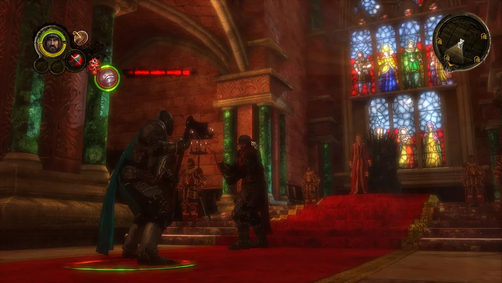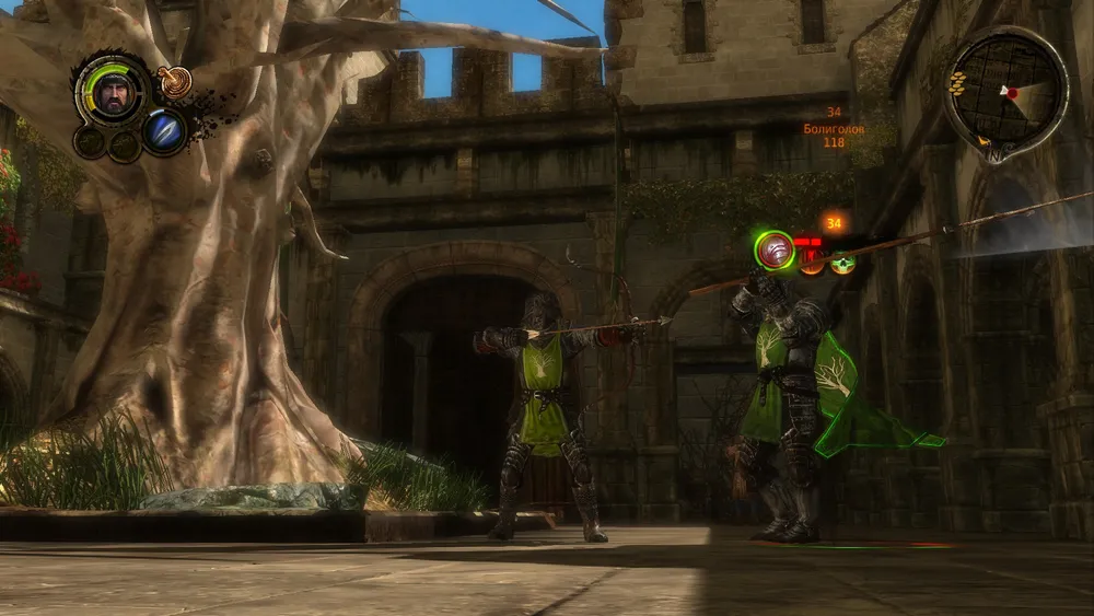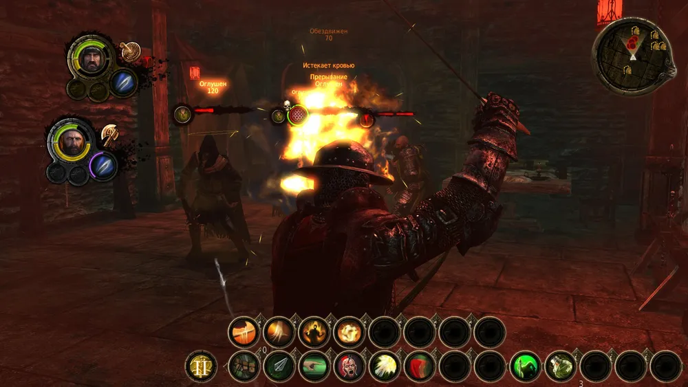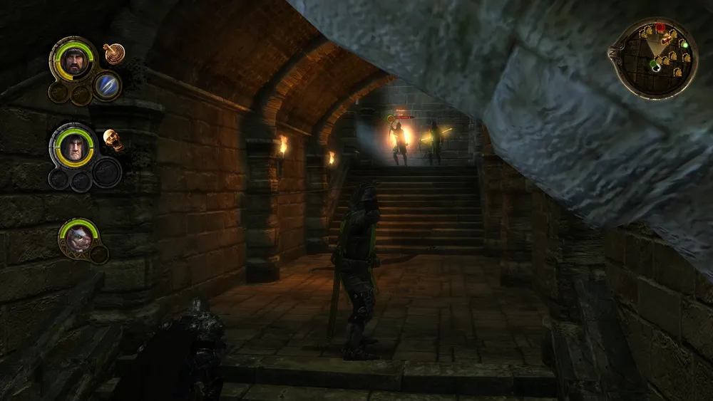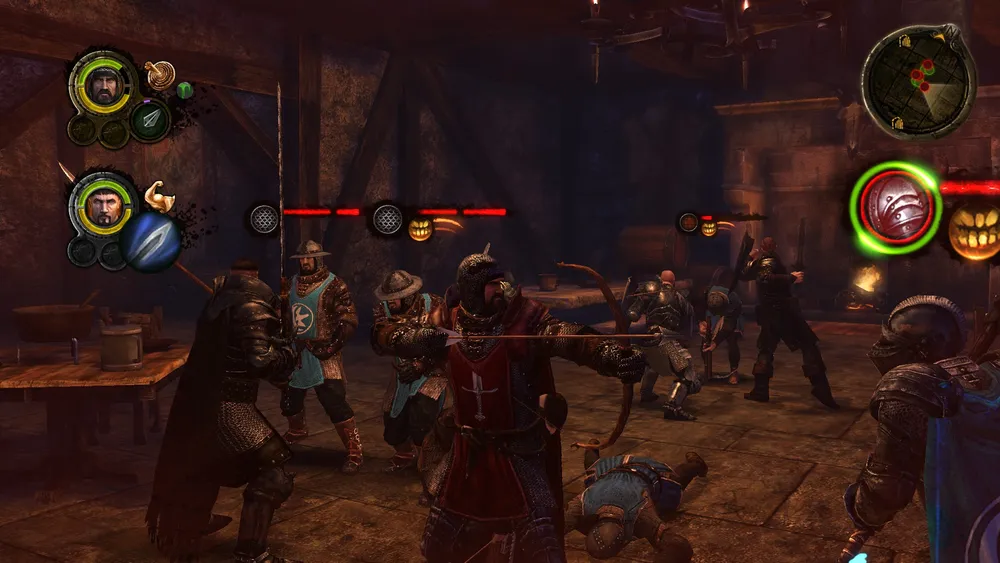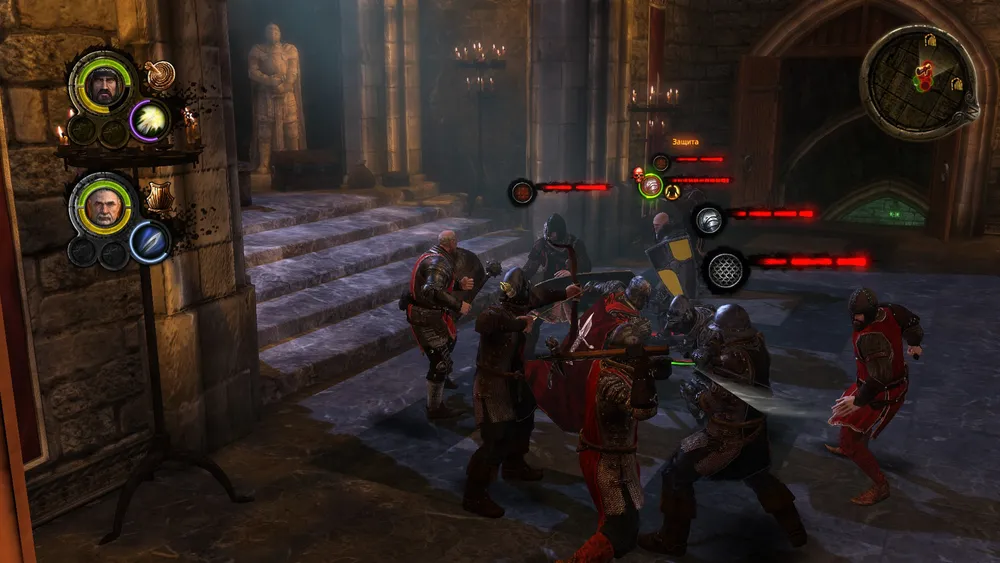 Вернуться к этому режиму можно в любой момент, особенно при возникновении критической ситуации. Например, напарник вот-вот погибнет, виалов с зельем здоровья у него не осталось, а энергии на самолечение не хватает. Кроме того, тяжелый мечник уже занес свой гигантский зазубренный меч, явно надеясь применить какой-то активный скилл и добить союзника. Тем не менее, есть еще десять секунд на принятие нужного решения. Если играть в этот момент за Вестфорда, можно перекинуть собаку с одного фронта на другой и молиться, что косорылый уродец успеет добежать до противника и вцепиться тому в лодыжку. Пока стальная горгулья люто трясет конечностью с висящей на ней псом, ударом копья выводим на две-три секунды противников послабее, переключаемся на напарника и выводим беднягу из передряги – лечиться и восстанавливать энергию. К сожалению, простора для маневров практически нет, так как чуть ли не половину времени приходится проводить во всевозможных казематах, подземельях и туннелях. Особенно от этого страдает герой со стойкой лучника – обычно он успевает выпустить лишь одну-две стрелы перед тем, как на него обрушатся топоры, молоты и дубины.
