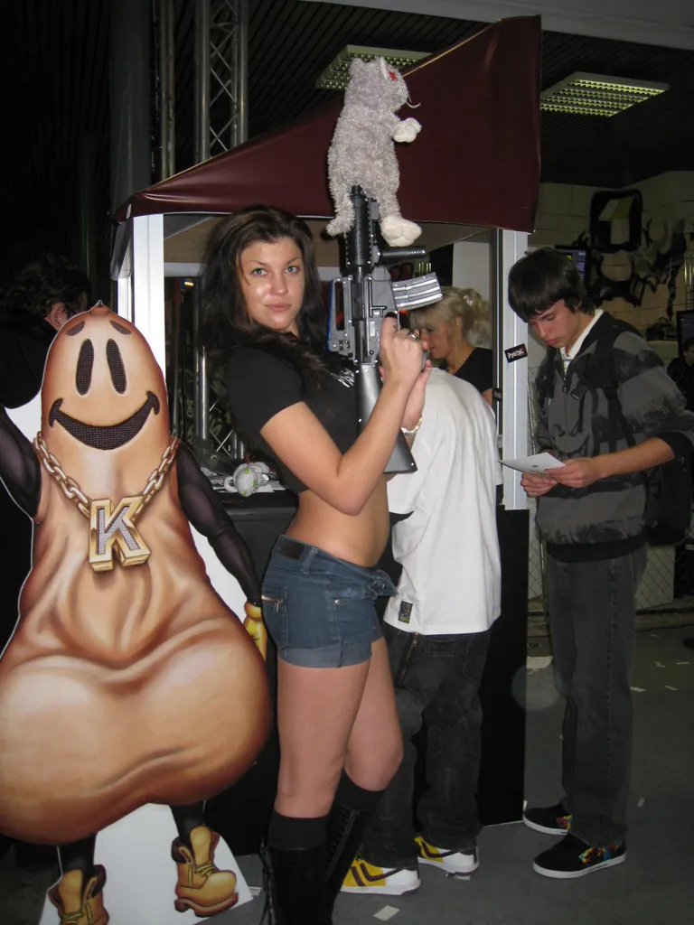 Посетителей мини-трейлерного парка встречали красивые девушки, игриво заманивая молодежь ненавязчиво расстегнутыми джинсовыми мини-юбочками и плюшевыми кошками, надетыми на стволы автоматов.