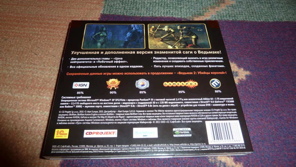 Передняя часть бональна как бонан и именно поэтому давайте стразу переидём к задней части. На ней расположено множество наград этой игры. Ведь она действительно великолепна. Также взади написано всё что входит в это издания и выделено красным, что сохранённые данные можно использовать в Ведьмаке 2. Наверное, специально, что бы купили. Возникает вопрос: а что, в прошлом издании это действовать не будет?! Публика конечно покупает. Впрочем ,как это сделал и я ,хотя мафиозо пожалуй купил для коллекции. На задней стороне внутренеей части мы можем увидеть точно такуюже картинку как на задней части Ведьмак дополненное издание. Только там не написано про Ведьмака 2. И не глянцевое. Дальше больше!