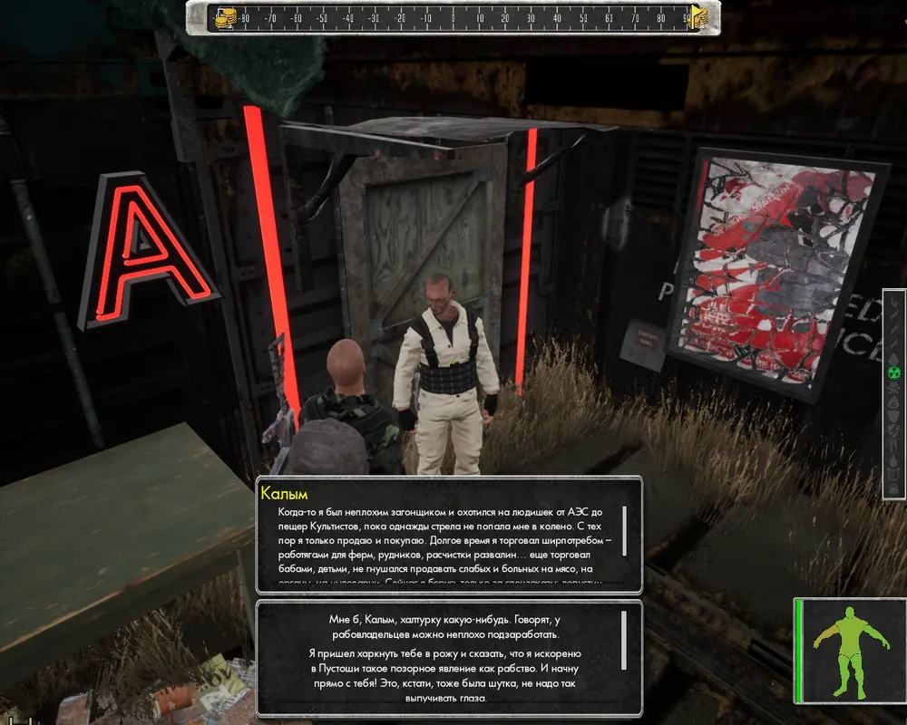 Бандитов в нормальном поселении я встретил всего пару раз. Зато в «диких» локациях, вроде входа в метро или заброшенного склада встреча с враждебными мобами обеспечена. Разумеется, вы также можете начать убивать и нейтралов, но тогда на вас накинется сразу весь посёлок.