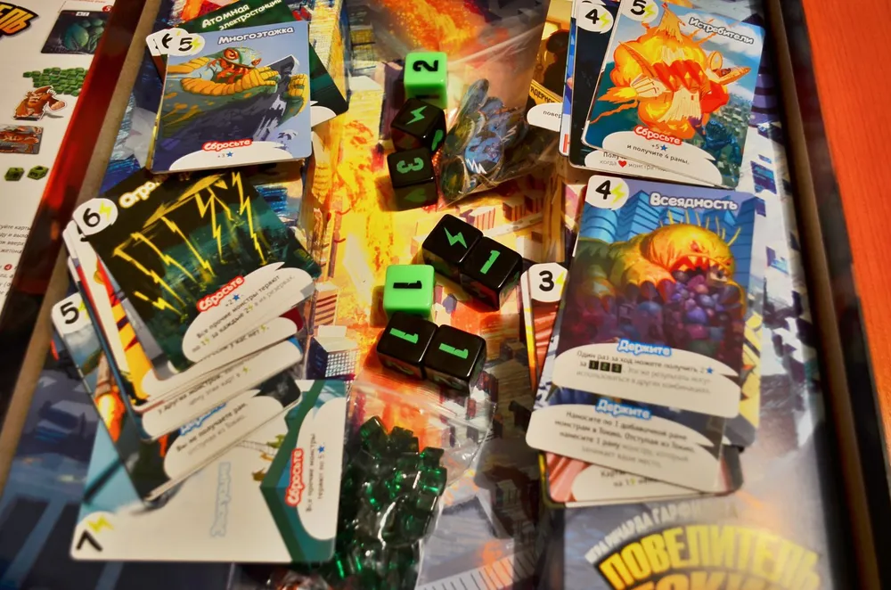 Кубики и каунтеры. Вот это реально порадовало. Дайсы не только имеют не стандартные грани, так еще и больше стандартных, прям под стать монстроузной тематике игры. Выполнены из качественного пластика, приятно лежать в руке и хорошо покрашены. Каунтеры же просто сразили. На отечественном рынке очень они редко встречаются не в виде картонок в тех играх, в которых их вообще предусматривают, а не оставляют это пункт на попечение игрока, типа "Плюхайся как хочешь". Тут HobbyWorld и авторы оригинальной версии порадовали и отсыпали мешочек красивых пластиковых полупрозрачных кубиков богатого изумрудного цвета. Очень здорово выглядит и поможет в игре. Хотя, и картинными фишечками не обделили.