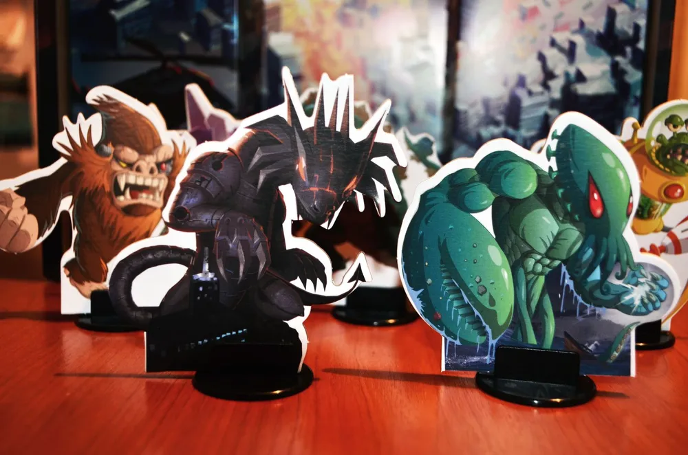 Далее - вкусняшка, а именно - монстры. Картонные спрайты изображают нам ужасных монстров... Точнее ужасно смешных монстров, представляющих собой собирательные образы гигантских чудовищ, роботов, инопланетян и прочих мутантов их дешевых фантастических фильмов, вроде Годзиллы или Кинг-Конга. Устанавливаются карточки в хорошие пластиковые подставки, из которых не выскальзывают и держатся на них уверенно.