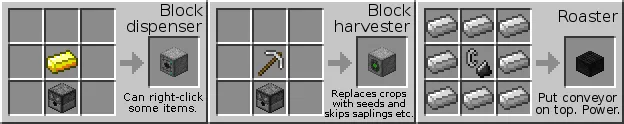 - Было уделено особенное что бы сделать возможным строить конвееры сверху других блоков даже если они имеют инвентари. Вы не можете открыть GUI с помощью конвеера, ворот или машины в ваших руках