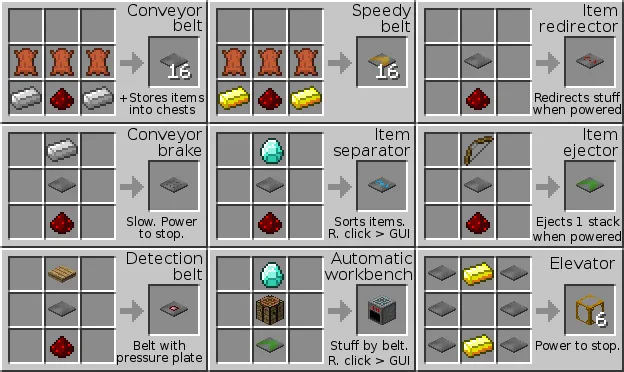 - Обеспечивает конвеерные ленты которые могут двигать предметы и мобы.