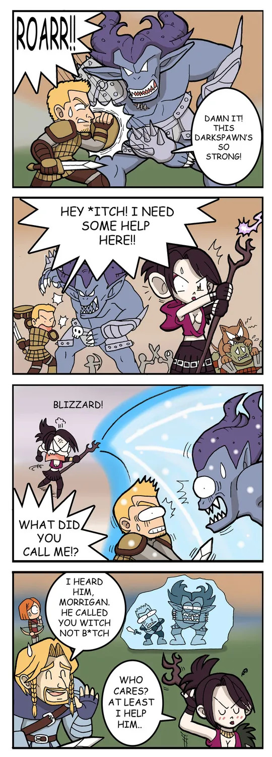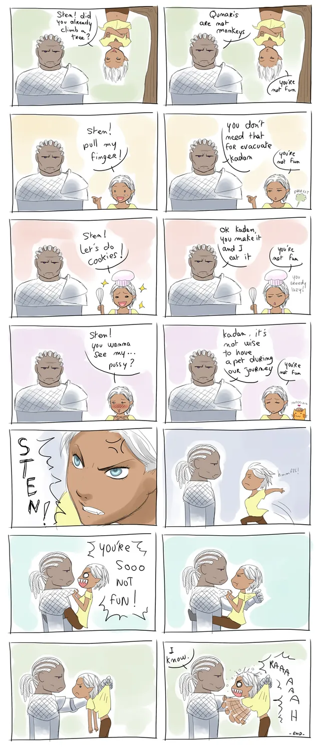1, 6,7,8,9,10,13,14,16. Они вообще не к месту. Одна шутит над ростом эльфов - в ДА2 они ростом с человека. Много Стэна которого в ДА2 нет, и как он теперь выглядит мы даже не может предположить. Причём ДА2 и Ледиа Аэдукан и Алистер от Aimo я вообще не понимаю...