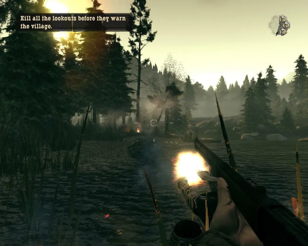 Большая часть игры — это перестрелки. В коротких заставках раскрываются причины происходящего, но процесс не меняется. Едем на лошади, навстречу бандиты — пальба. Сбегаем в карете, нас преследуют бандиты — опять пальба. Плывем на каноэ, встречаем индейцев — снова пальба.