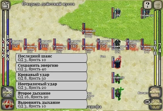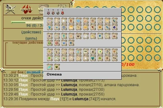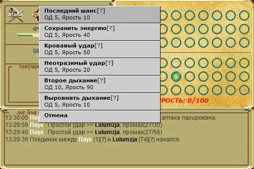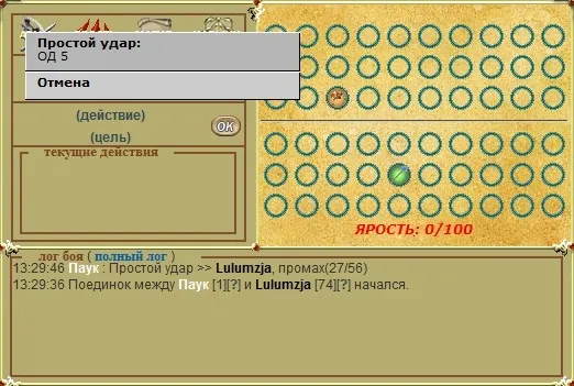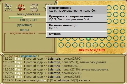 Бои проходят в реальном времени, каждый персонаж имеет показатель Очки действия(ОД), который увеличивается с течением времени. При накоплении достаточного количества ОД для выполнения самого первого действия из списка Текущих действий, оно автоматически выполняется. Количество ОД, необходимое для выполнения различных действий(указывается в описании действия) рассчитывается по следующему правилу: 20(базовое значение ОД) + модификаторы ОД со всех надетых на аватара вещей(указывается в требованиях вещи) + модификатор ОД выполняемого действия. Для помещения действия в список Текущих действий необходимо выбрать его в одном из разделов (Атака, Защита, Магия, Навыки), после чего название действия появится под полоской ОД, а все доступные цели на поле боя выделятся красной рамкой. После выбора цели ее имя появится напротив названия удара, после чего необходимо нажать кнопку Ок и действие будет помещено в список текущих.