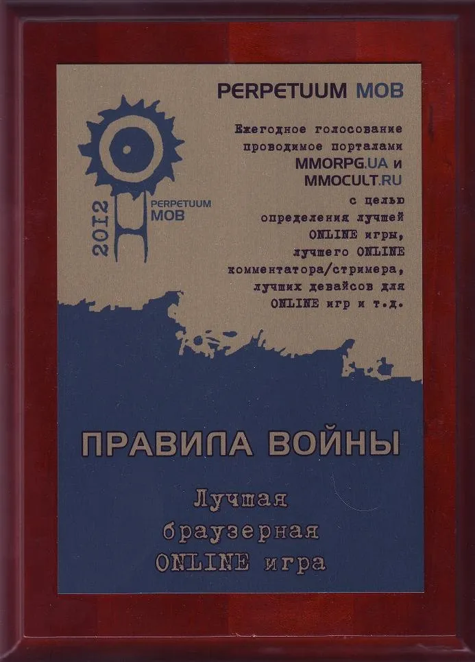 В результате голосования Perpetuum MOB 2012 в номинации "Лучшая браузерная ONLINE игра" победили «Правила Войны»! Нашими конкурентами были такие монстры, как Command & Conquer: Tiberium Alliances и Drakensang Online, но командоры отстояли честь ядерных Пустошей!