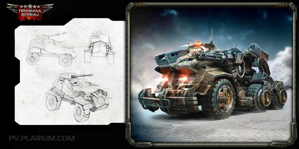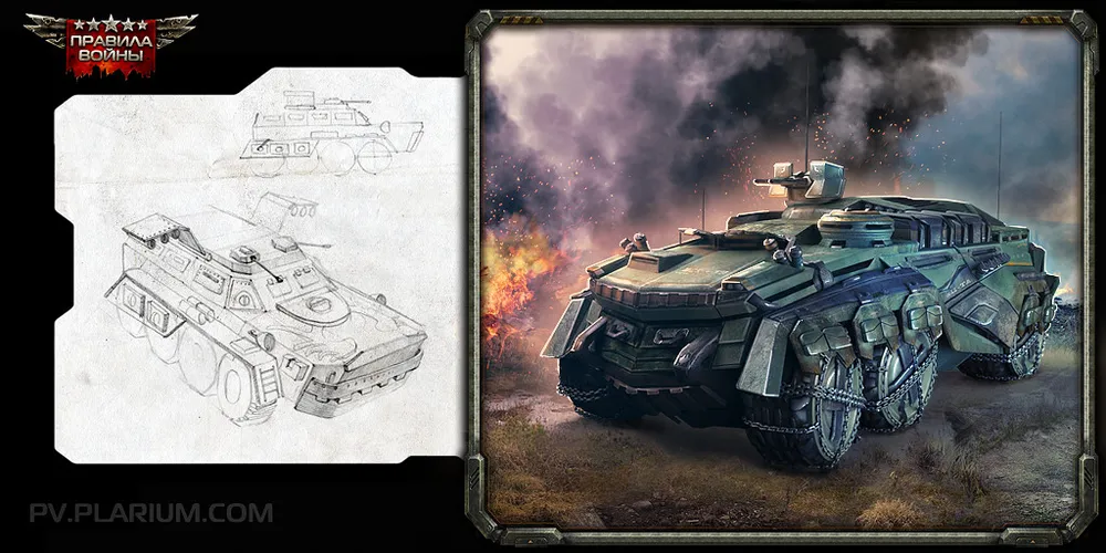 Наброски техники Легиона из второй версии сценария и финальные игровые версии. БМП «Рем» и БТР «Ромул» еще не знают, что через несколько месяцев они станут «Кротом» и «Вараном».