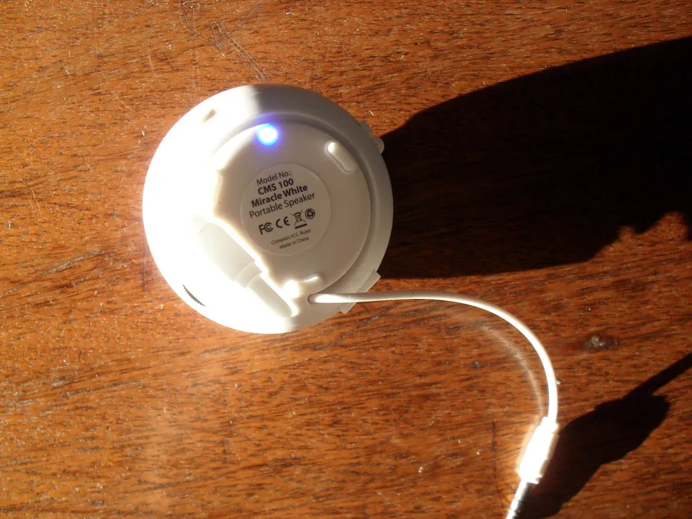 Внизу расположен светодиодный индикатор работы\зарядки, который горит синим, если колонка работает и красным, если она стоит на зарядке. По дну, в специальном желобе, располагается встроенный в колонку аудиокабель 3.5 мм миниджек, который подключается к любому устройству, обладающим соответственным входом (плеер, телефон, ноутбук, etc). Возможно покажется неудобным, что он весьма короткий, всего около 11 см.
