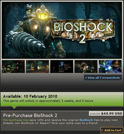 С этого момента в Steam доступна возможность предварительного заказа BioShock 2, на котором вы можете сэкономить 10% и заработать копию первой части абсолютно бесплатно! Если у вас уже есть первая часть игры, то вы можете сделать подарок своим друзьям.