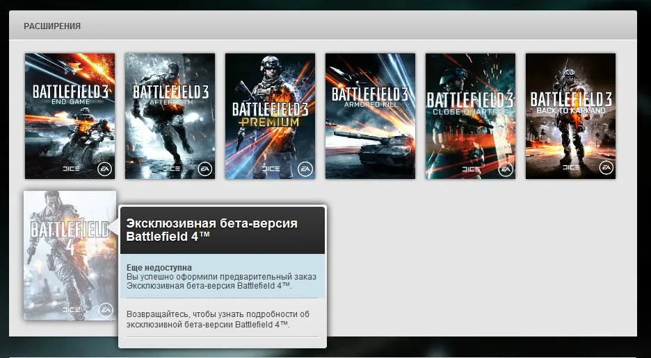 В русском сегменте Origin стартовал сбор предварительных заказов на Battlefield 4. Для предзаказа доступны 2 издания: стандартное издание и издание Digital Deluxe. Если в первом случае при предзаказе дают саму игру и дополнение, то уже во втором кроме этого гарантируется доступ к эксклюзивной бета-версии игры и бонусный контент, информацию о котором объявят позже.