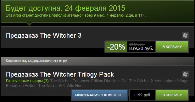 Также можно купить The Witcher Trilogy Pack, в который включены: The Witcher: Enhanced Edition Director's Cut, The Witcher 2: Assassins of Kings Enhanced Edition и The Witсher 3: Wild Hunt по цене 1199 рублей. Правда здесь без скидки.