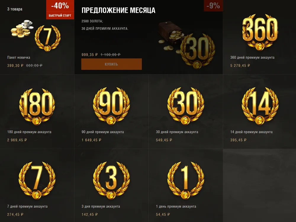 Цена на премиум-аккаунт в танках на порядок дороже. 30 дней премиума за 550 рублей. Доступны также варианты на 1, 3, 7 , 14, 90, 180 и 360 дней. Годовая подписка стоит ~5300 рублей. Не дурно.