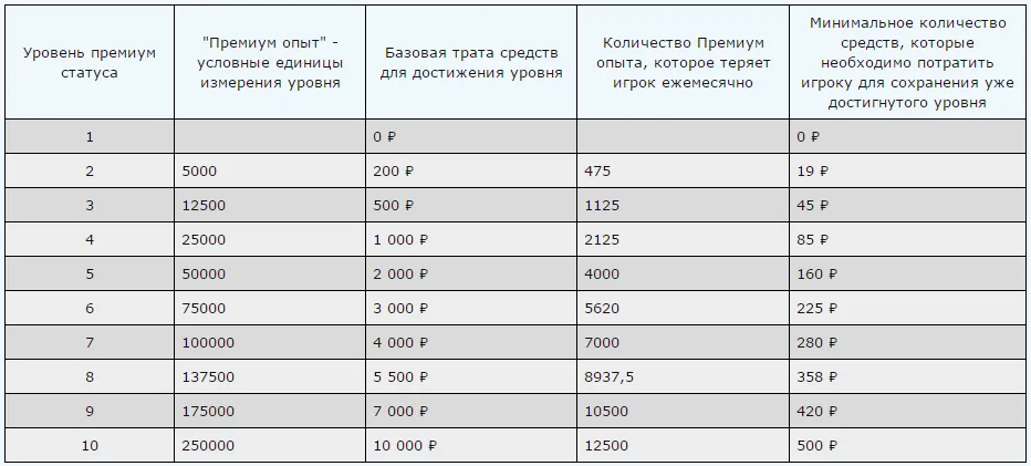 Премиум уровень необходимо поддерживать определенным уровнем трат в месяц. Если покупок игроком не производится премиум уровень постепенно падает.